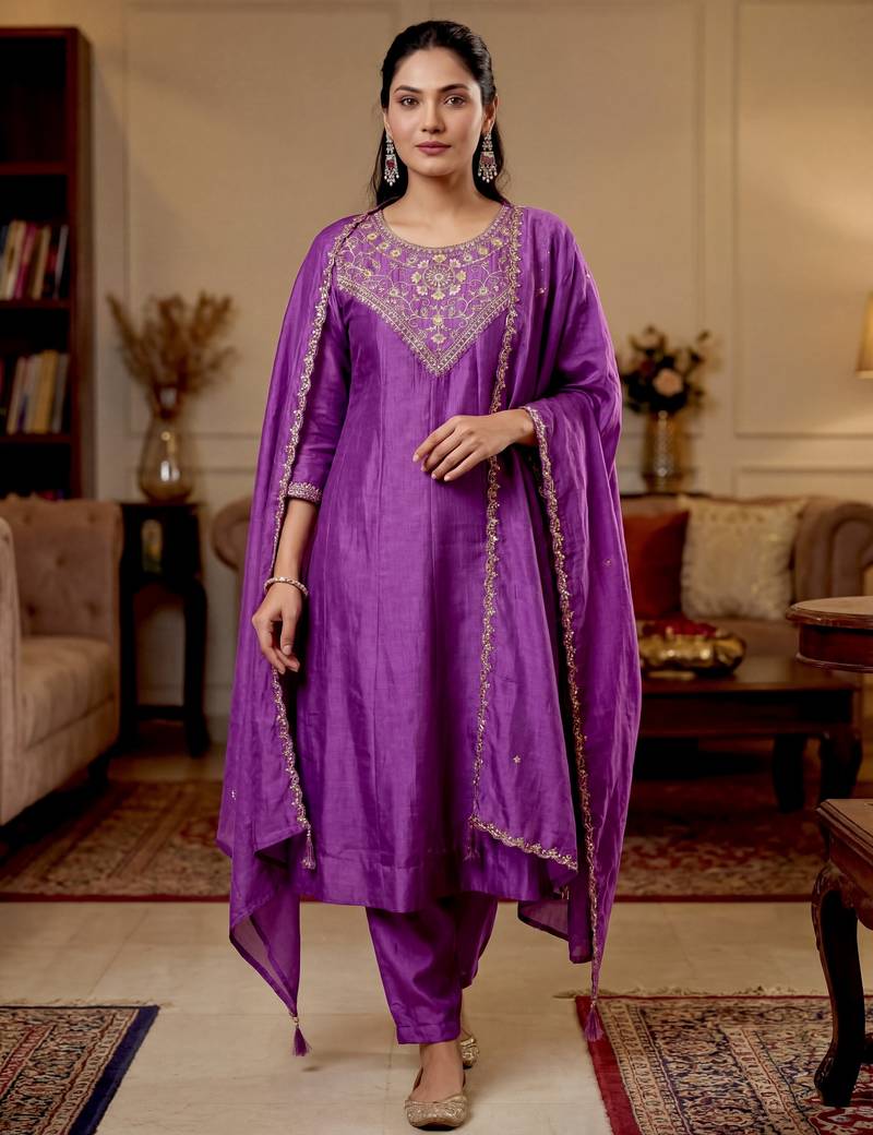 • Product Id : 4718085 • Package Details : 1 Kurta/1 Bottom/1 Dupatta • Type : Kurta Sets • Fabric : Art Silk • Work : Embroidered • Type : Resham Embroidery • Look : Designer • Sleeve : Half Sleeve • Neck Style : Round Neck • Color : Purple • Stitching : Stitched • Length : 40.0 • Side Slit : Yes Payments [+]