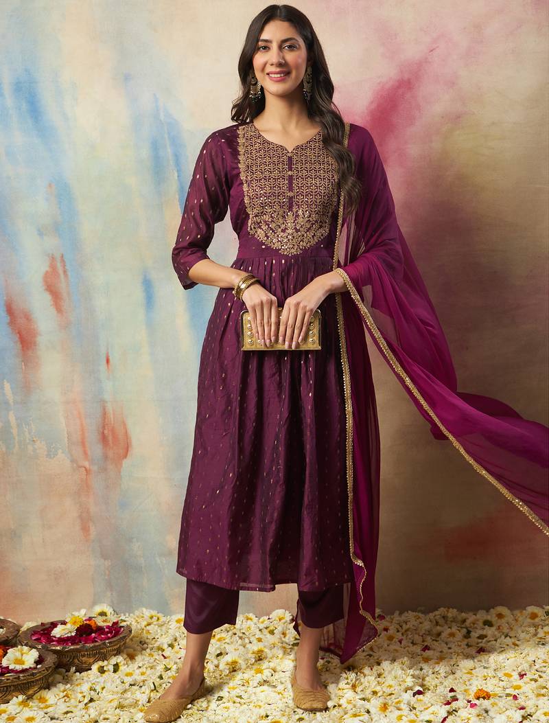 • Product Id : 4718034 • Package Details : 1 Kurta/1 Bottom/1 Dupatta • Type : Kurta Sets • Occasion : Ceremonial • Fabric : Art Silk • Work : Embroidered • Type : Resham Embroidery • Look : Designer • Sleeve : Half Sleeve • Neck Style : Round Neck • Color : Purple • Stitching : Stitched • Length : 40.0 • Side Slit : Yes Payments [+]