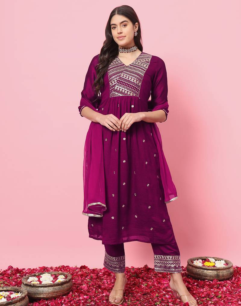 • Product Id : 4718015 • Package Details : 1 Kurta/1 Bottom/1 Dupatta • Type : Kurta Sets • Fabric : Art Silk • Work : Embroidered • Type : Resham Embroidery • Look : Designer • Sleeve : Half Sleeve • Neck Style : V Neck • Color : Purple • Stitching : Stitched • Length : 40.0 • Side Slit : Yes Payments [+]