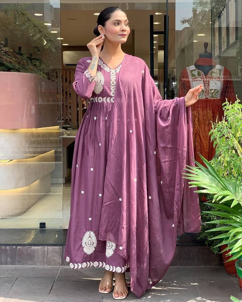 Purple P V Chanderi Embroidered Embroiderd Stitched Suit