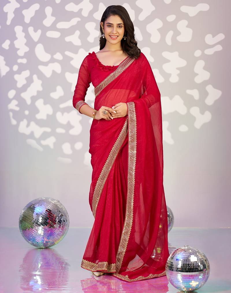 Red Color Crunchy Fabric Embroidery Work Ready To Wear Saree