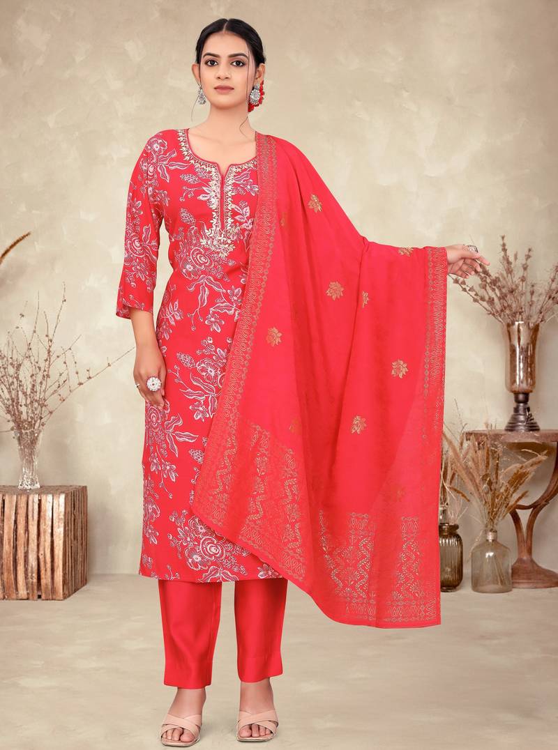• Product Id : 4674354 • Package Details : 1 Kurta/1 Bottom/1 Dupatta • Type : Kurta Sets • Occasion : Casual • Fabric : Art Silk • Work : Embroidered • Type : Abstract Print • Look : Designer • Sleeve : Half Sleeve • Neck Style : Round Neck • Color : Red • Stitching : Stitched • Length : 40.0 • Side Slit : Yes Payments [+]