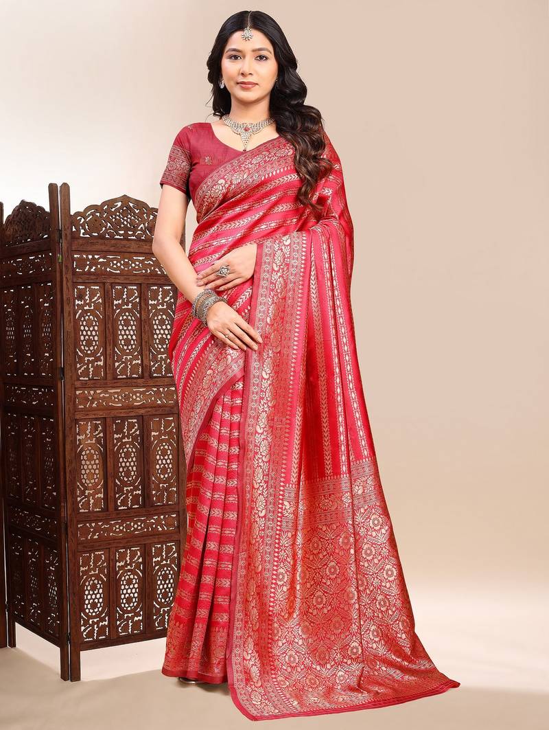 Red Color Ethnic Lichi Silk Fabric Graceful Woven Designer Saree