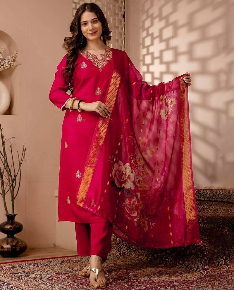 Red Ethnic Silk Blend Kurta Set With Dupatta
