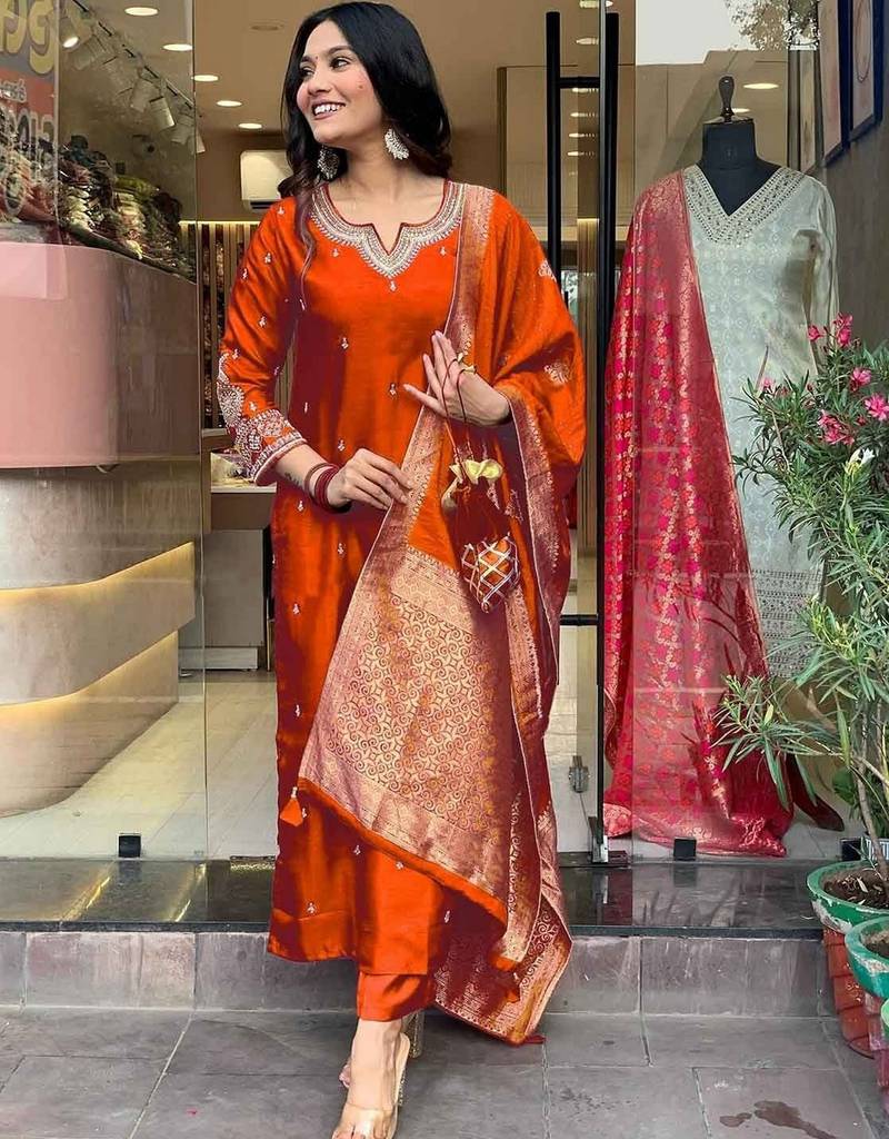Looking These Suit in Fine Colored Pair With Bottom And Dupatta.These Top Are Cotton And Bottom Are Fabricated On Silk Blend Pair With Jacquard Silk Dupatta.Its Beautified With Designer Embroidery Work.