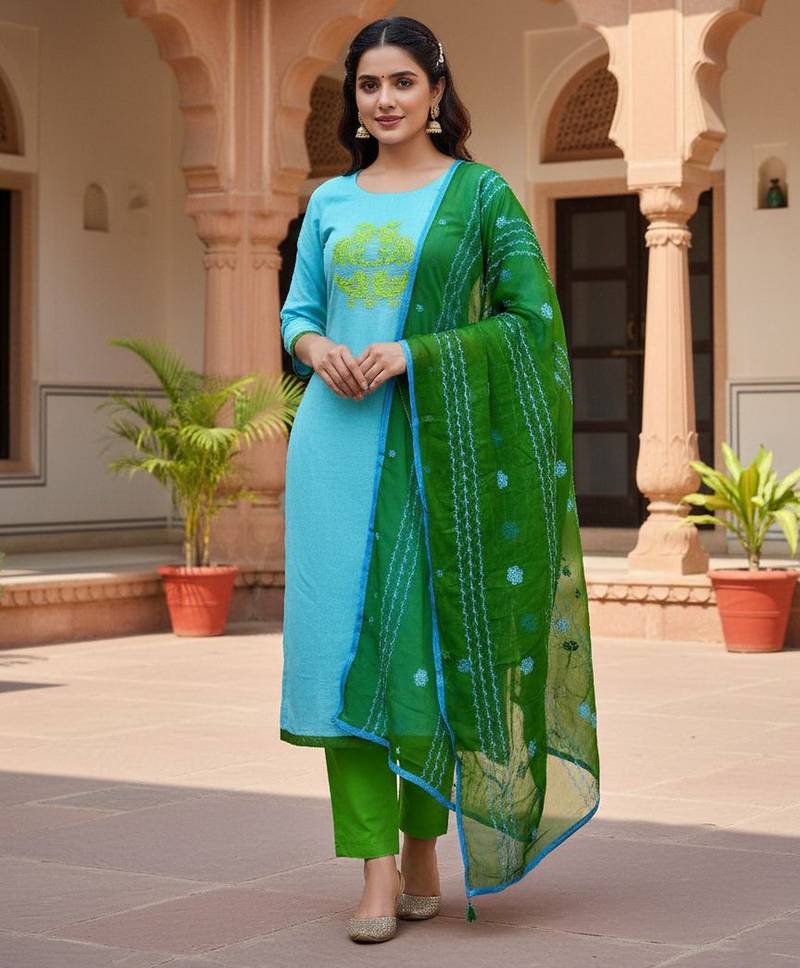 • Style : Salwar • Fabric : Chanderi • Color : Green • Color : Green Dupatta Details