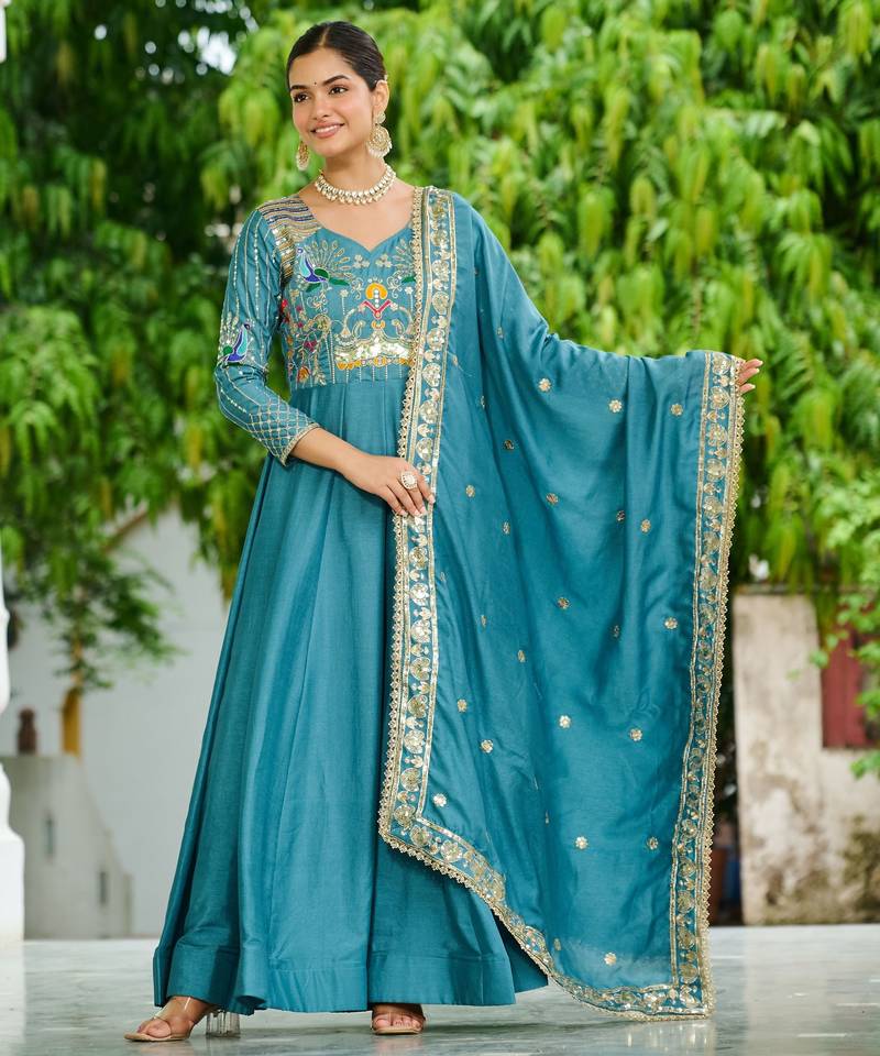 Garb These Beautiful Looking Party Wear Readymade Long Gown With Dupatta.These Gown Are Vichitra Silk And Dupatta is Fabricated On Vichitra Silk.Its Beautified With Designer Multy Thread,Jari,Sequance Embroidery Work.