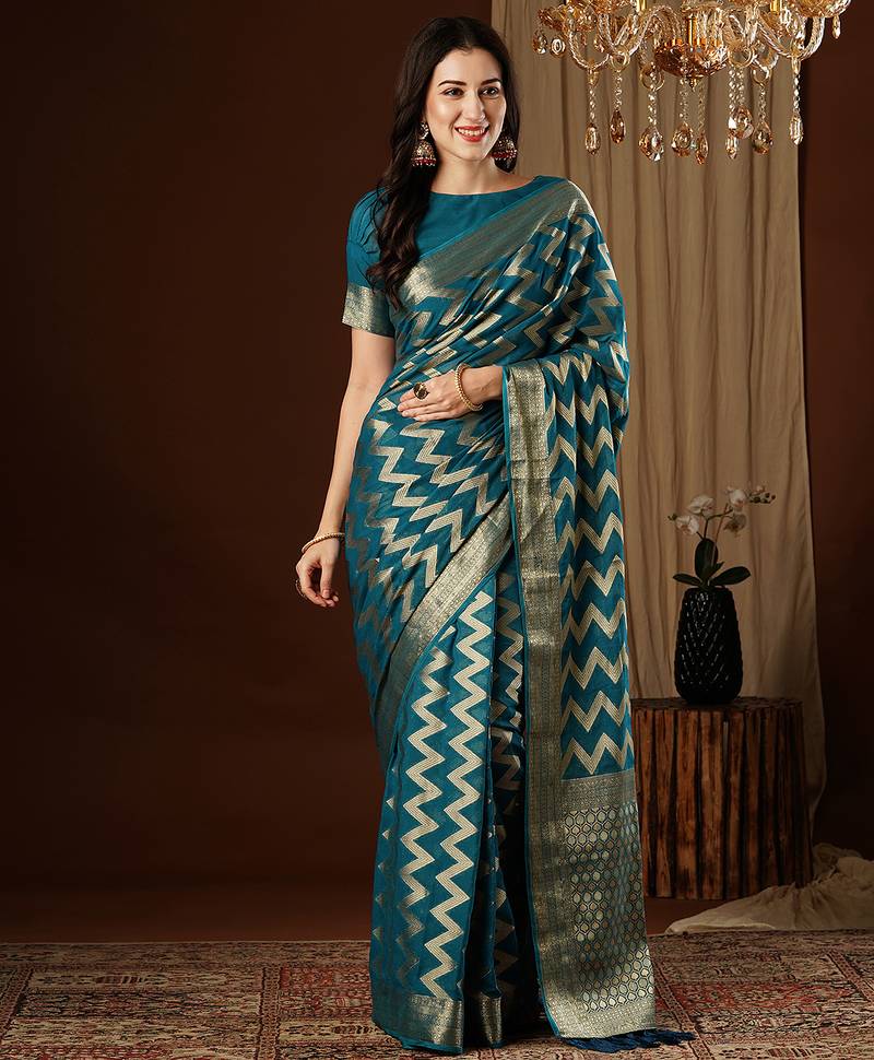 Teal Blue Color Beautiful Woven Ethnic Georgette Fabric Ceremonial Saree