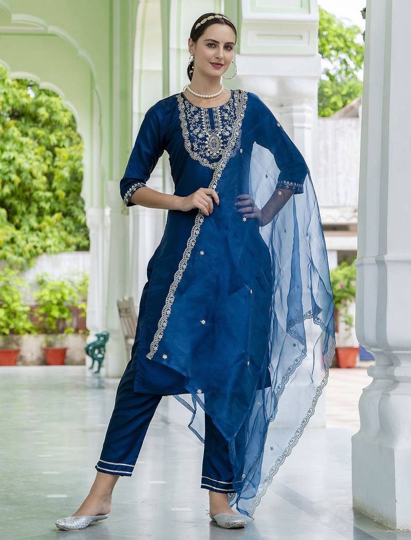 • Product Id : 4718112 • Package Details : 1 Kurta/1 Bottom/1 Dupatta • Type : Kurta Sets • Fabric : Art Silk • Work : Embroidered • Type : Resham Embroidery • Look : Designer • Sleeve : Half Sleeve • Neck Style : Round Neck • Color : Teal Blue • Stitching : Stitched • Length : 40.0 • Side Slit : Yes Payments [+]