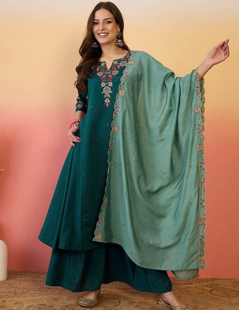 Teal Chanderi Silk Embroidered Readymade Palazzo Dress