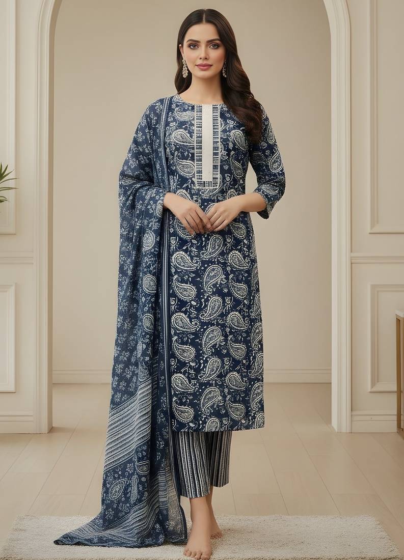 • Product Id : 4701990 • Package Details : 1 Kurta/1 Bottom/1 Dupatta • Type : Kurta Sets • Fabric : Cotton • Work : Printed • Type : Resham Embroidery • Look : Designer • Sleeve : Half Sleeve • Neck Style : Asymmetrical Neck Kameez • Color : Teal • Stitching : Stitched • Length : 40.0 • Side Slit : Yes Payments [+]