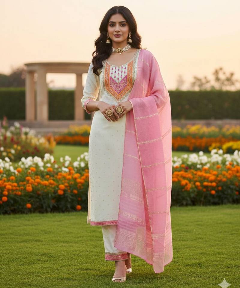 • Product Id : 4684578 • Package Details : 1 Top/1 Bottom/1 Dupatta • Type : Kurta Sets • Occasion : Wedding • Work : Woven • Type : Resham Embroidery • Look : Fashion • Sleeve : Half Sleeve • Neck Style : Round Neck • Stitching : Unstitched • Fabric : Jacquard • Color : White Stitching [+]