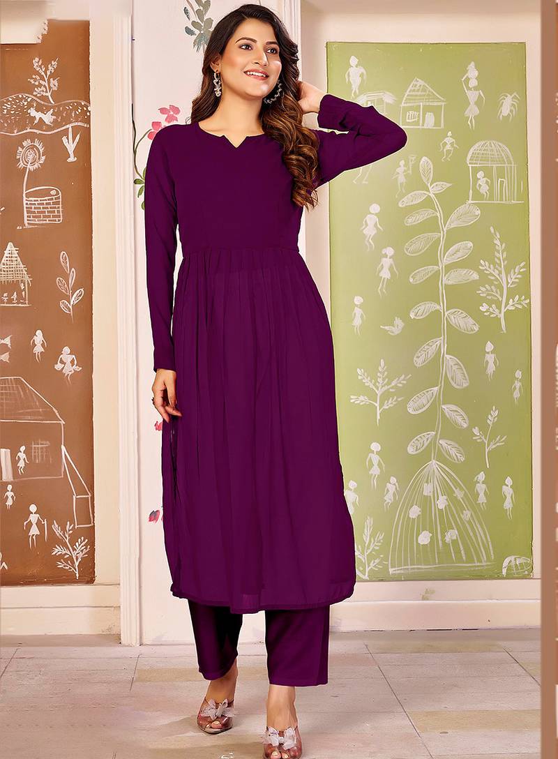 Wine Color Beautiful Solid Printed Georgette Fabric Festive Long Kurta For Girls