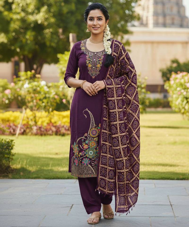 • Style : Salwar • Fabric : Santoon • Color : Wine • Color : Wine Dupatta Details
