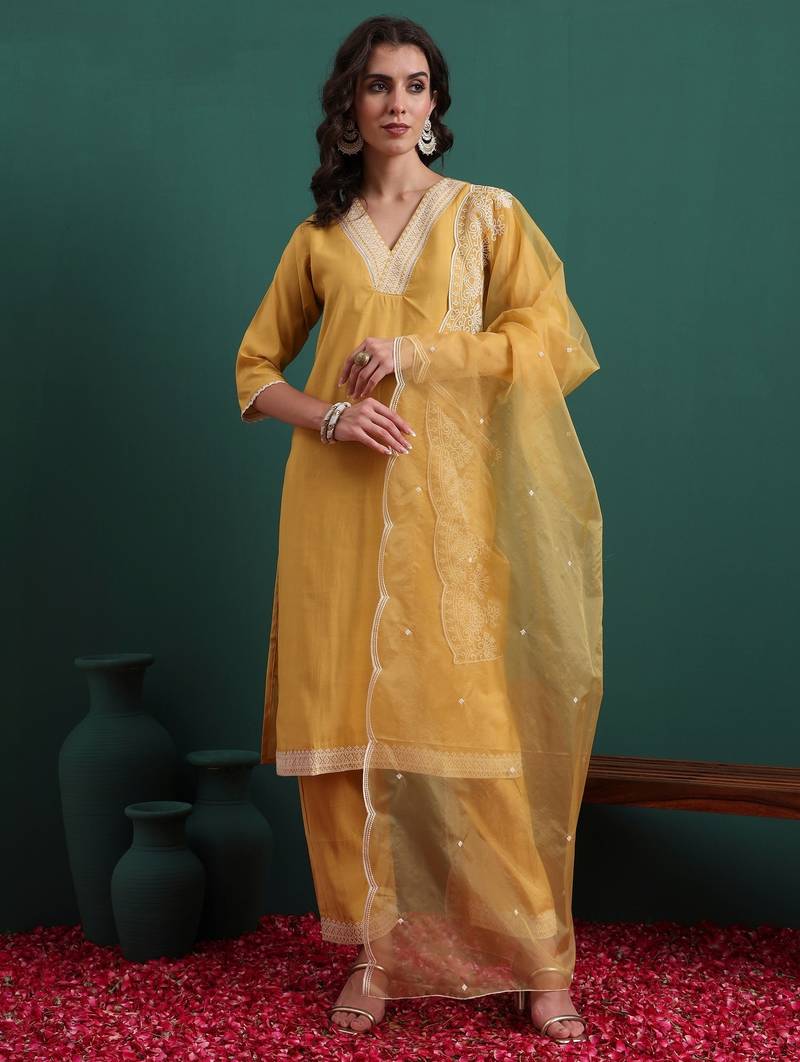 • Product Id : 4717968 • Package Details : 1 Kurta/1 Bottom/1 Dupatta • Type : Kurta Sets • Fabric : Art Silk • Work : Embroidered • Type : Resham Embroidery • Look : Designer • Sleeve : Half Sleeve • Neck Style : V Neck • Color : Yellow • Stitching : Stitched • Length : 40.0 • Side Slit : Yes Payments [+]
