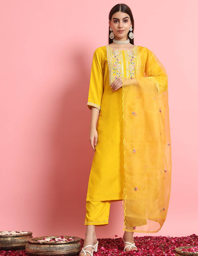 • Product Id : 4718113 • Package Details : 1 Kurta/1 Bottom/1 Dupatta • Type : Kurta Sets • Fabric : Art Silk • Work : Embroidered • Type : Resham Embroidery • Look : Designer • Sleeve : Half Sleeve • Neck Style : Round Neck • Color : Yellow • Stitching : Stitched • Length : 40.0 • Side Slit : Yes Payments [+]