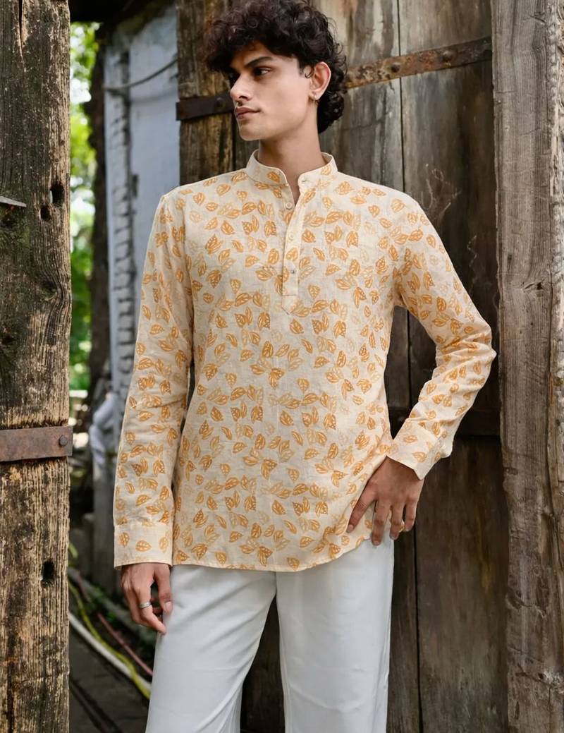 Yellow Color Linen Fabric Smart And Casual Short Kurta For Men's