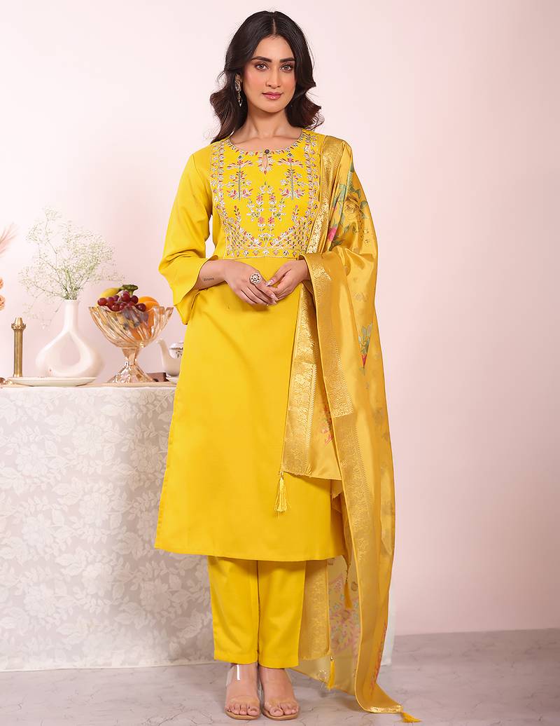 • Product Id : 4718159 • Package Details : 1 Kurta/1 Bottom/1 Dupatta • Type : Kurta Sets • Occasion : Festive • Fabric : Art Silk • Work : Embroidered • Type : Resham Embroidery • Look : Designer • Sleeve : Half Sleeve • Neck Style : Asymmetrical Neck Kameez • Color : Yellow • Stitching : Stitched • Length : 40.0 • Side Slit : Yes Payments [+]
