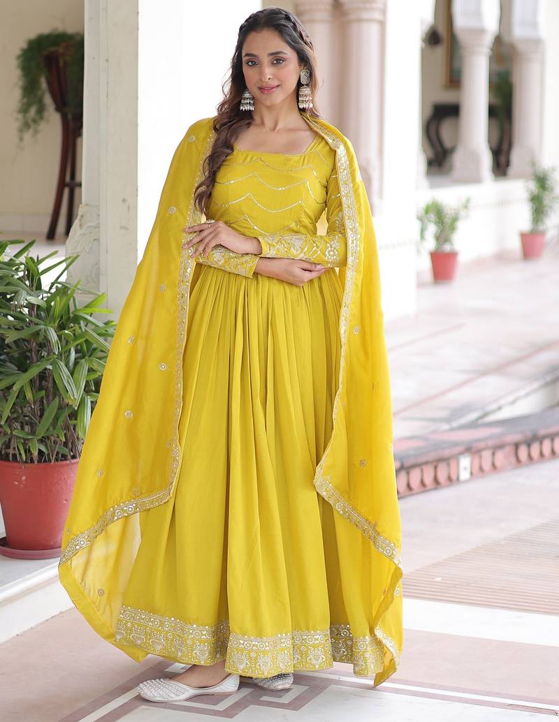 Attactive These Beautiful Looking Readymade Long Gown With Dupatta.These Gown And Dupatta is Fabricated On Vichitra Silk.Its Beautified With Designer Sequance Embroidery Work.