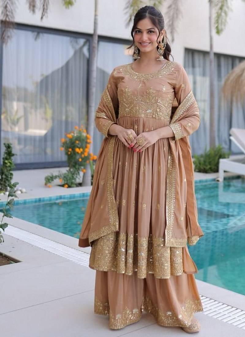 Brown Sequins Embroidered Work Stitched Kurti Sharara With Dupatta Set