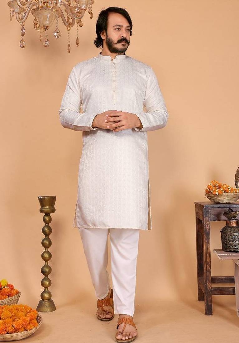 Men’s Heavy Jacquard Silk Off White Kurta With Cotton Pyjama