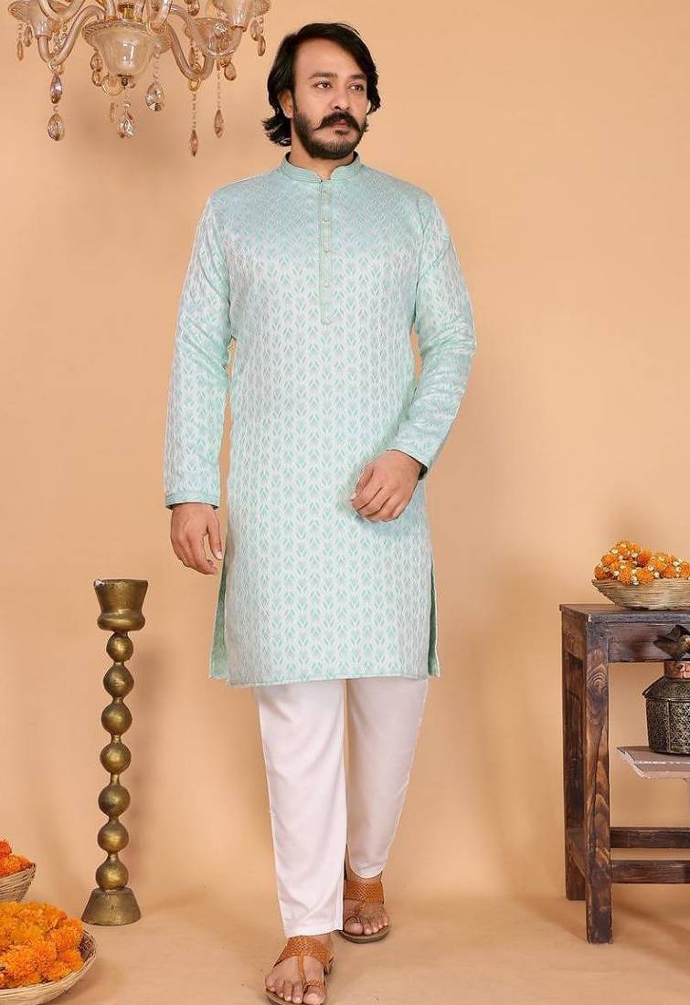 • Men’s Heavy Jacquard Silk Sky Blue Kurta With Cotton Pyjama