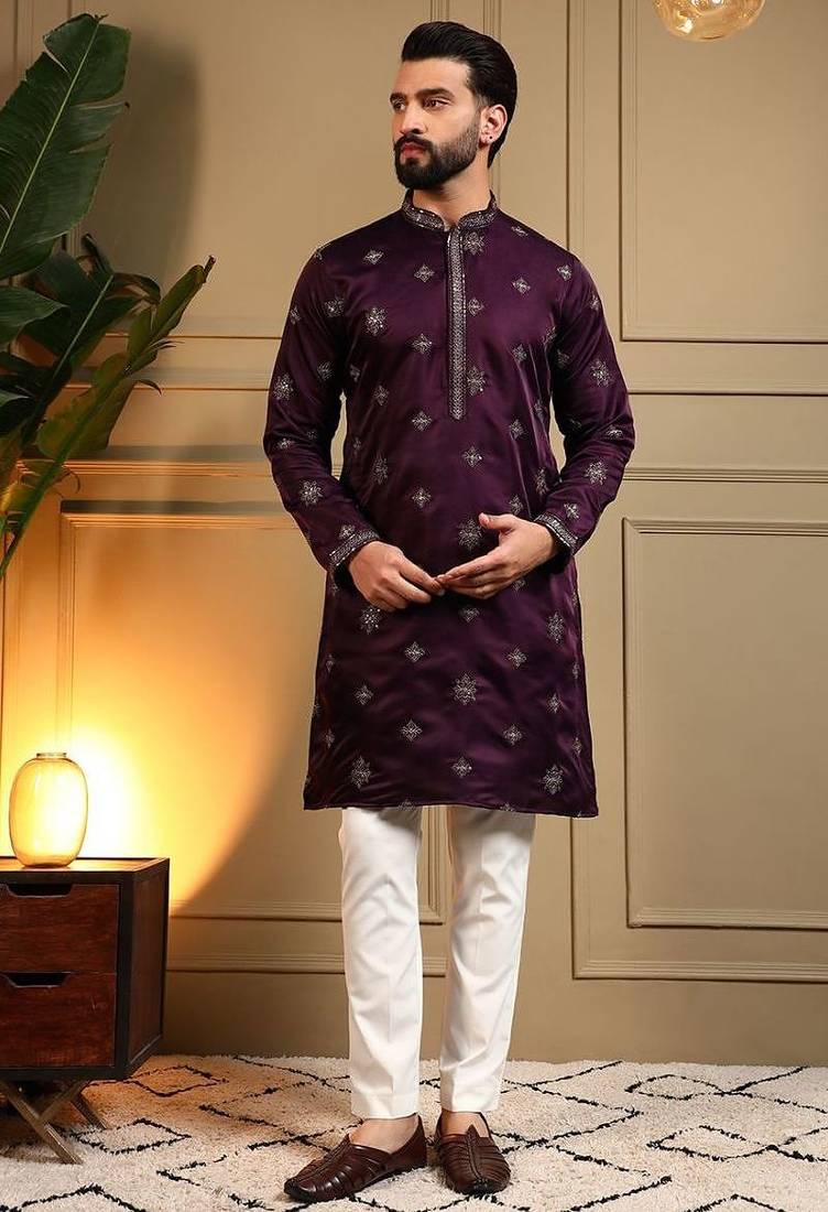 • Product Id : 4708808 • Package Details : 1 Kurta 1 Pyajama • Type : Kurta Pajama • Fabric : Silk • Work : Embroidered • Type : Sequins Work • Color : Wine • Top Color : Purple • Top Fabric : Silk • Stitching : Stitched Payments [+]