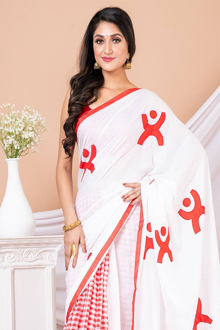 Red & White Aplique Cotton Saree Without Blouse