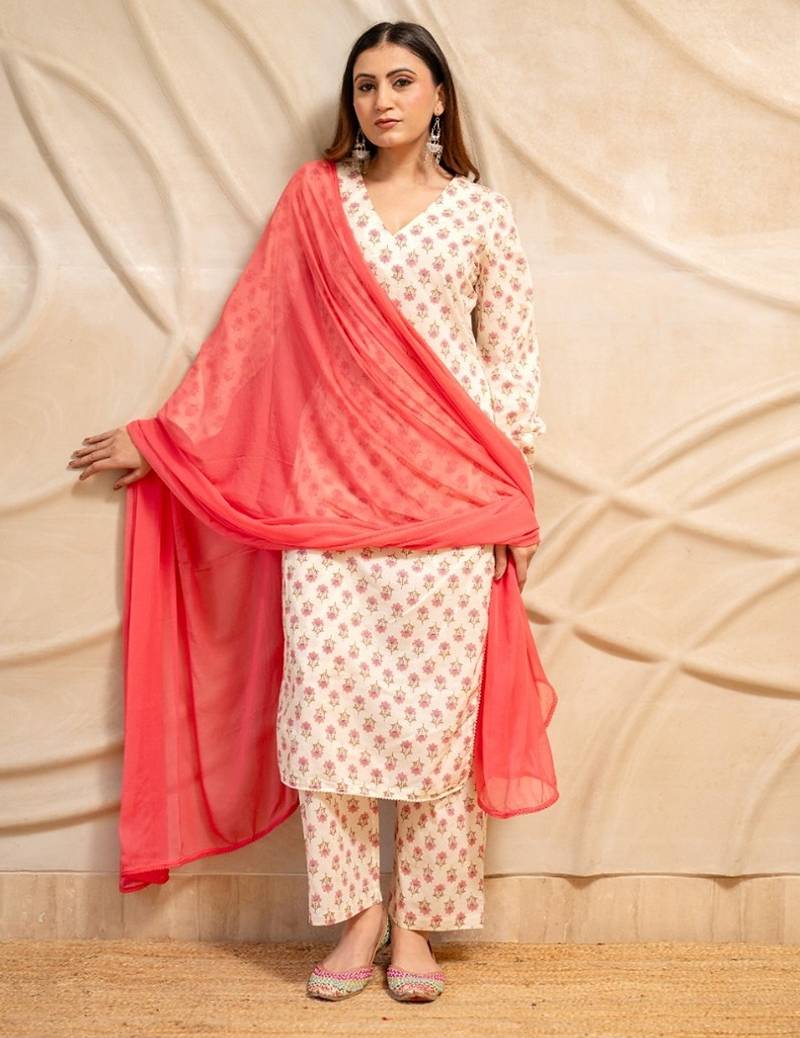 Bring soft elegance to your ethnic wardrobe with this beautiful cream floral printed kurta set. Crafted from breathable cotton fabric, the kurta features delicate all-over floral motifs and a flattering V-neckline. Paired with matching straight-fit pants and a contrasting coral pink dupatta, this set is perfect for everyday wear, office wear, and light festive occasions.
