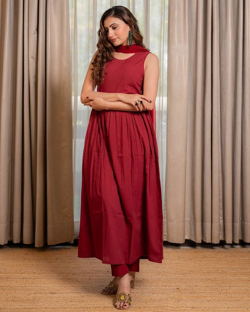 • Product Id : 4701160 • Package Details : 1 Kurta / 1 Pant / 1 Dupatta • Type : Kurta Sets • Fabric : Cotton • Work : Plain • Type : Anarkali Suits • Look : Fashion • Sleeve : Sleeveless • Neck Style : Round Neck • Color : Maroon • Stitching : Stitched • Length : 48.0 Payments [+]