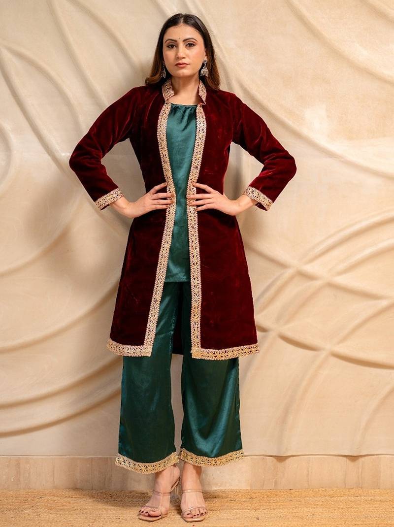 Maroon Velvet Jacket With Green Kurta & Palazzo Set Of 3
