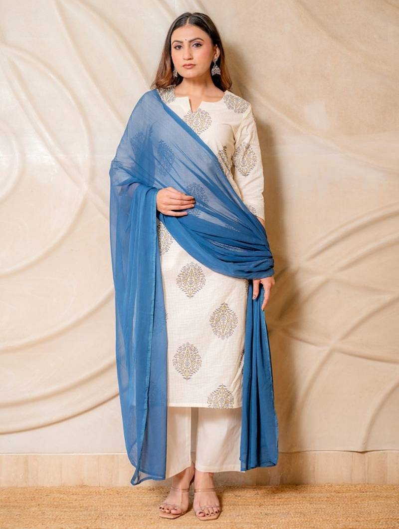 Enhance your everyday ethnic style with this elegant off-white printed kurta set. Featuring subtle traditional motifs, a classic straight silhouette, and paired with comfortable pants and a flowy blue dupatta, this set is perfect for office wear, casual outings, and festive gatherings.