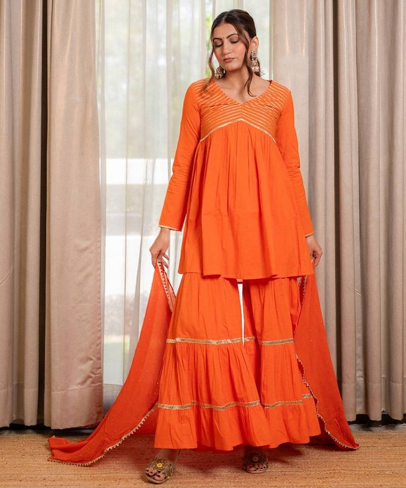 This Three Piece Set Include Kurta with Sharara and Dupatta. Orange Cotton Blend Sharara with Golden Got To Lace Detailing. Embrace Timeless Elegance with The Golden Gota Work On This Elegant Sharara Set, A Three-Piece Ensemble That Exudes Sophistication and Grace. To Complete The Look, The Set Includes A Dupatta, Featuring Intricate Goat Patti Work Detailing. This Sharara Set Is Perfect for Festive Celebrations, Weddings, and Special Occasions, Ensuring You Look Effortlessly Elegant and Graceful.