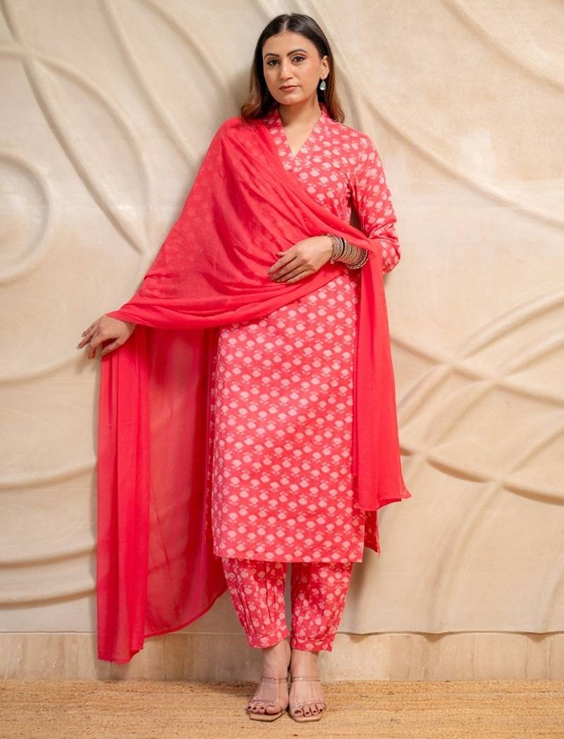 • Product Id : 4709204 • Package Details : 1 Kurta / 1 Pant / 1 Dupatta • Type : Kurta Sets • Fabric : Cotton • Work : Printed • Type : Block Print • Sleeve : Half Sleeve • Neck Style : V Neck • Color : Pink • Stitching : Stitched • Length : 46.0 Payments [+]