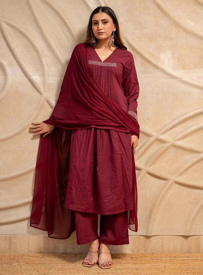 Refresh your ethnic wardrobe with this elegant wine-colored kurta set, designed with a graceful pleated front and subtle contrast detailing. Crafted in breathable cotton fabric, this set offers all-day comfort with a refined look. Paired with straight-fit pants and a soft, flowy dupatta, it is perfect for workwear and understated festive occasions.