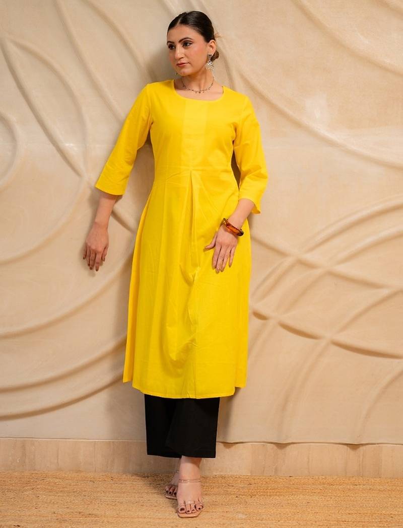 Brighten up your everyday ethnic look with this elegant yellow kurta set. Crafted in a comfortable solid fabric with a clean silhouette, this outfit is perfect for office wear, casual outings, and day events.