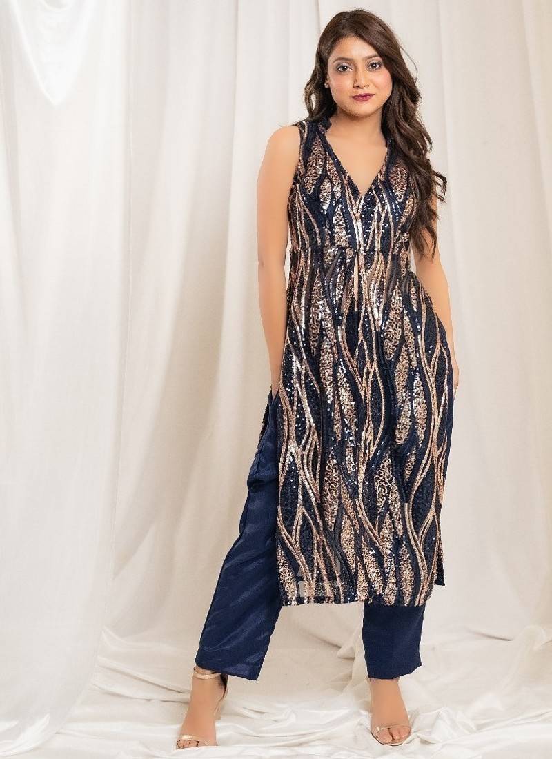 A sophisticated navy blue Indo-Western set highlighted by a stunning copper sequin embroidered top. Paired with matching navy blue shantoon bottoms, the ensemble radiates subtle glamour and timeless charm. Perfect for evening events, festive gatherings, or cocktail nights, it strikes a refined balance between contemporary flair and traditional elegance.