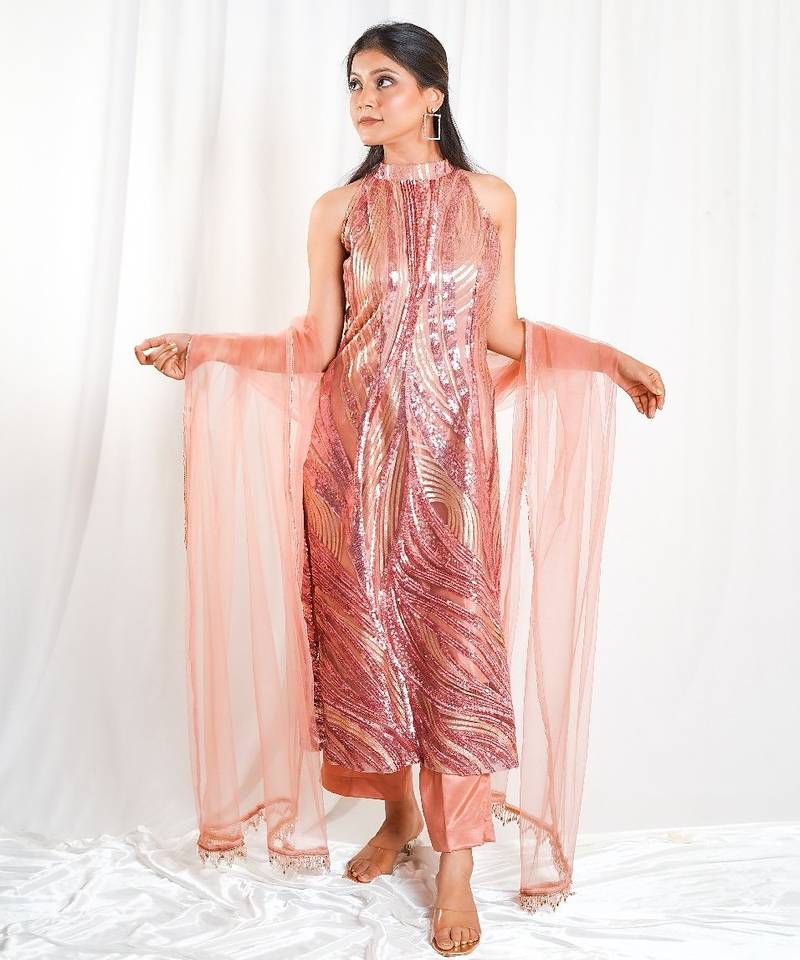 A graceful rose gold Indo-Western set featuring a golden sequin-embroidered top paired with rose gold shantoon bottoms. The look is completed with a rose gold net dupatta adorned with gold beads, rose gold pearl border, and a shimmering gold cutdana border—an ethereal choice for weddings, festive celebrations, or elegant soirées.