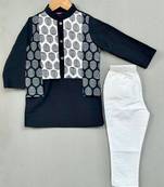 Dress your little one in timeless elegance with this attached Jacket Set. The outfit includes a solid black kurta paired with white straight pants and is layered with a beautifully printed black-and-white attached jacket. The jacket features an all-over traditional leafy motif and wooden buttons, adding a stylish ethnic charm. Crafted from soft, breathable fabric, this set offers both comfort and a polished festive look.