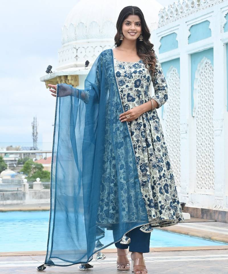 Blue Lily Floral Cotton Anarkali Stitched