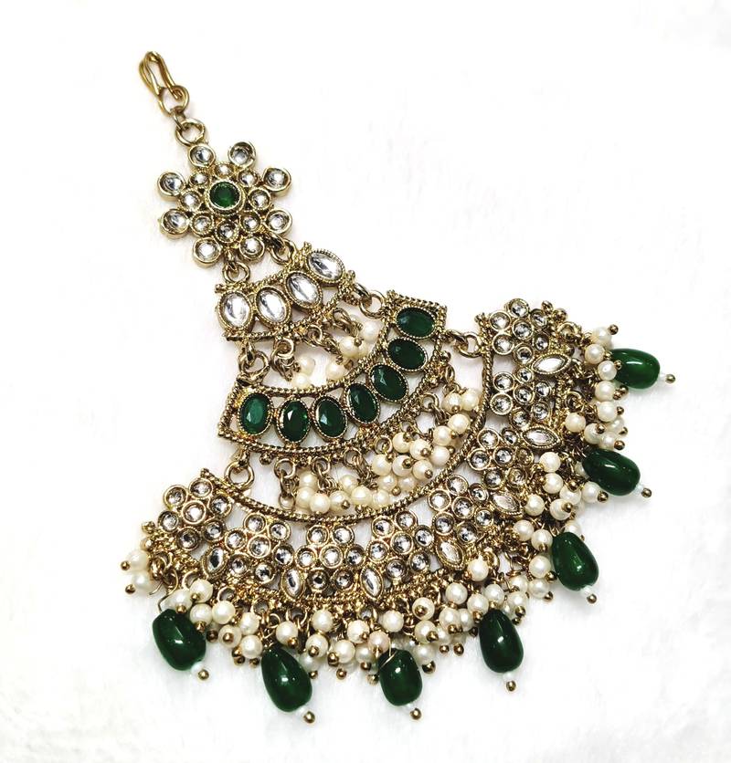 • Product Id : 4727482 • Package Details : 1 Maang Tikka • Type : Maang Tikka • Occasion : Bridal • Look : Designer • Jewellery Work : Kundan • Color : Green • Plating : Antique Gold • Base Material : Alloy • Height : 10.0 • Width : 8.0 • Care : Avoid Contact With Chemicals Such As Perfumes, Sprays And Water. Do Not Store In Velvet Boxes. Keep In Airtight Boxes. Wipe Jewelry With A Soft Cotton Cloth • Finish : Glossy Payments [+]