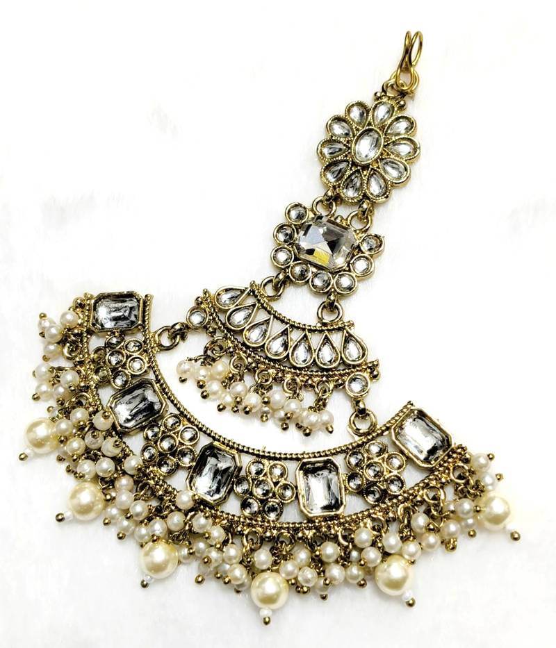 • Product Id : 4727472 • Package Details : 1 Maang Tikka • Type : Maang Tikka • Occasion : Bridal • Look : Designer • Jewellery Work : Kundan • Color : White • Plating : Antique Gold • Base Material : Alloy • Height : 10.0 • Width : 8.0 • Care : Avoid Contact With Chemicals Such As Perfumes, Sprays And Water. Do Not Store In Velvet Boxes. Keep In Airtight Boxes. Wipe Jewelry With A Soft Cotton Cloth • Finish : Glossy Payments [+]
