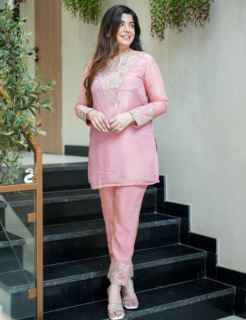Elegant Pink Silk Sequin Embroidery V Neck Co Ord Set