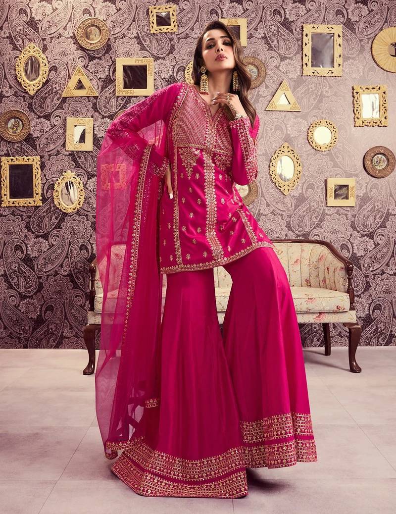 Pink Chanderi Silk Sequin Kurta Palazzo Set With Embroidered Net Dupatta