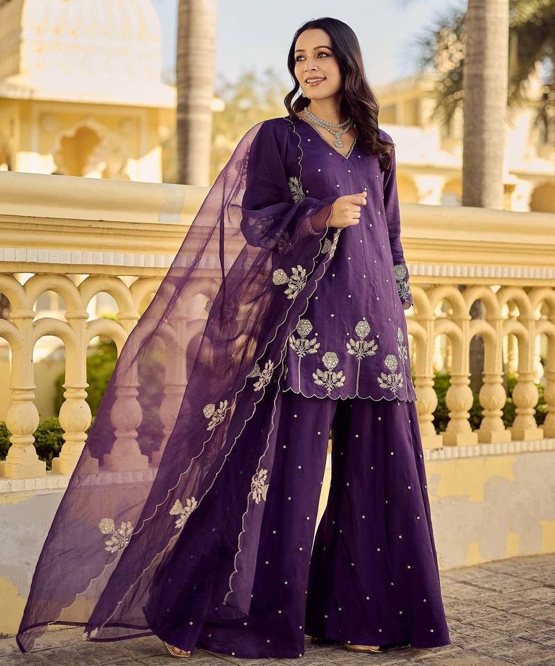 If you find the product for less we'll match it! Know MoreIndulge in royal sophistication with our Women's French Chanderi Silk Sequin Embroidery V-Neck Purple Kurta Pant Set. This exquisite readymade suit is a masterclass in ethnic elegance, offering a majestic alternative to a traditional Anarkali suit or Churidar suit. Crafted from premium Chanderi silk, the kurta features a sharp, flattering V-neckline adorned with intricate sequin embroidery, making it a premier choice among heavy-work kurtis. The deep purple hue adds a sense of luxury, perfect for those seeking designer kurta sets that make a statement.
