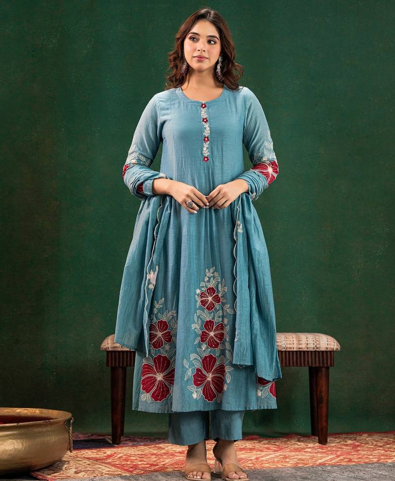 Accompanied by a matching sky blue embroidered Chanderi dupatta, this salwar suit set with dupatta is designed for high-impact occasions. Whether you need a sophisticated Eid-kurti, a vibrant Diwali-kurti, or a graceful party wear kurta set for women, this ensemble fits perfectly. It provides the polished look of designer kurta sets while maintaining the breathability of ethnic kurtis. Transition from a formal event to a festive gathering with ease in this silk kurta set for women, a premium addition to any women's Indian salwar kameez set collection