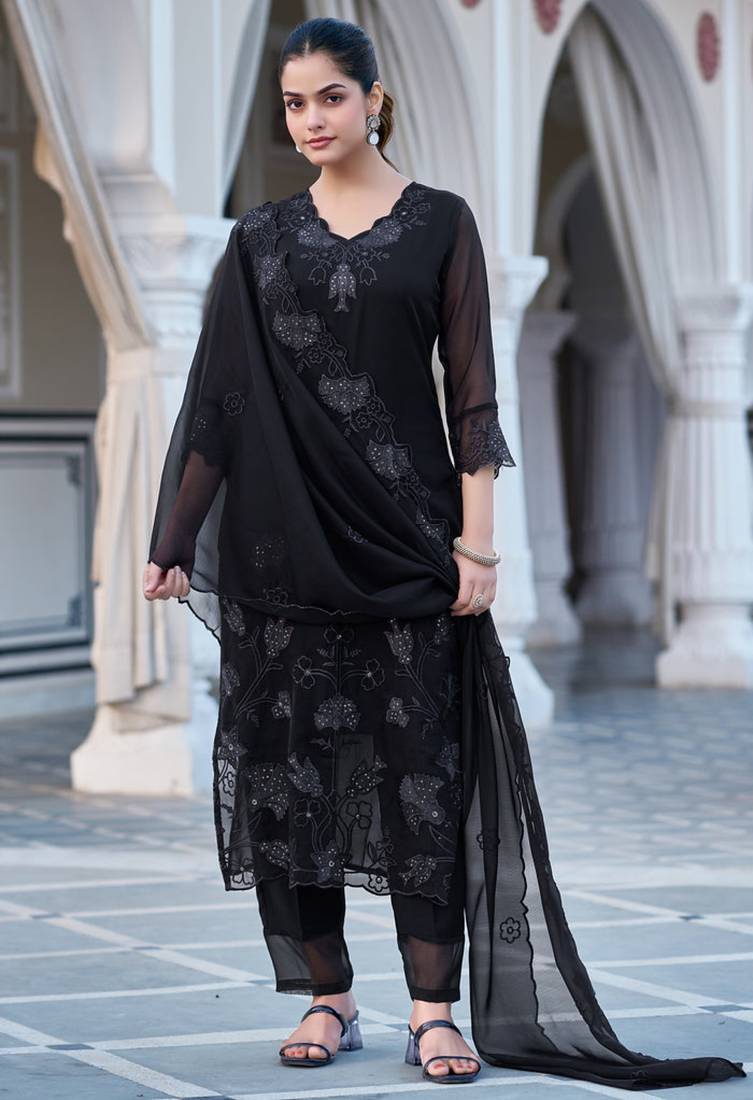 Step into timeless elegance with this stunning Women's Georgette Sequin Stone Embroidery V Neck Black Kurta Pant Set with Embroidered Georgette Dupatta. Crafted from premium georgette fabric, this beautiful kurta set for women offers the perfect combination of comfort, sophistication, and festive charm. The stylish black kurta features delicate sequin stone embroidery with a flattering V-neck design, creating a graceful ethnic look inspired by classic Anarkali Suit, Pakistani Suit, and Churidar Suit styles.