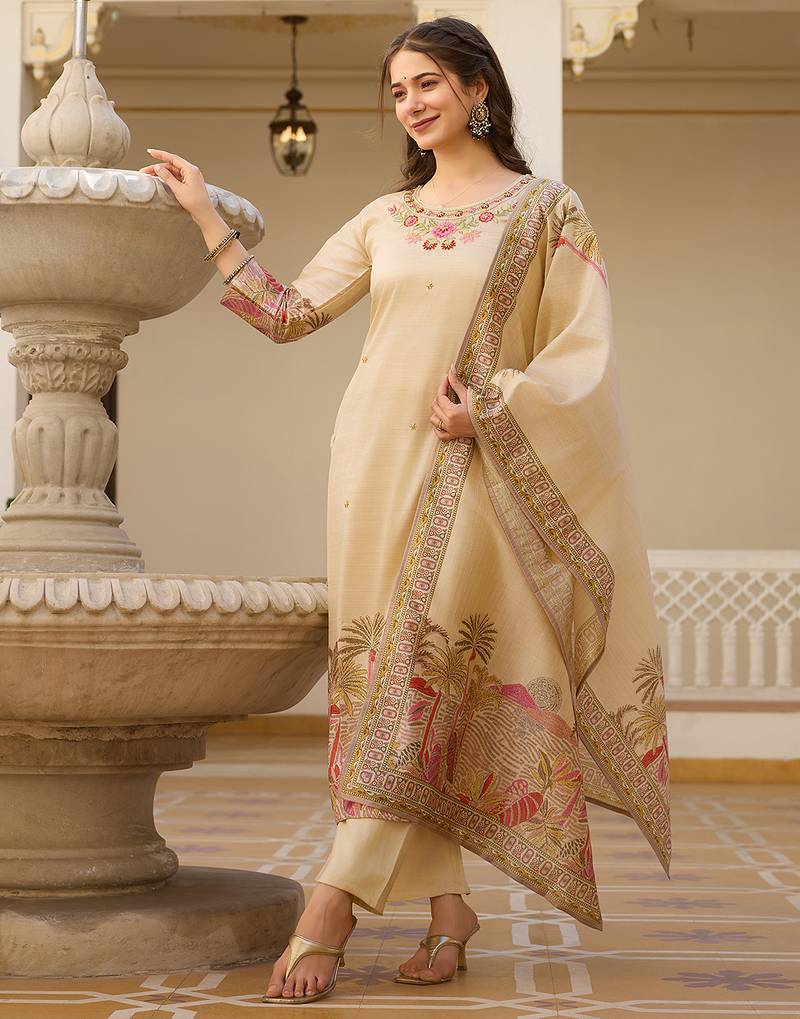 Enhance your festive wardrobe with this elegant Cream kurta pant set for women, crafted from premium viscose silk for a soft, flowing drape. The round neck kurta is adorned with delicate sequin embroidery, creating a luxurious and stylish ethnic look. Paired with matching tailored pants and a beautifully printed silk dupatta, this ensemble makes a perfect party wear kurta set for women, Anarkali Suit, Pakistani Suit, or salwar suit set for women. Ideal for weddings, Diwali, Eid, and other festive occasions, this designer kurta set combines traditional craftsmanship with modern style, offering comfort, elegance, and versatility for every celebration. Elevate your ethnic collection with this stunning kurta pant set with dupatta, perfect for gifting or personal festive styling.
