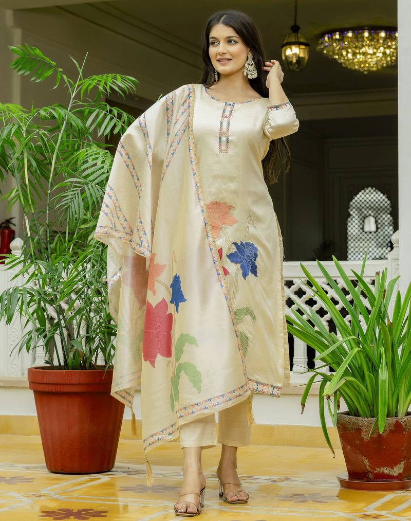 Women's Cream Viscose Silk Sequin & Stone Embroidered Kurta Pant Set With Printed Silk Dupatta