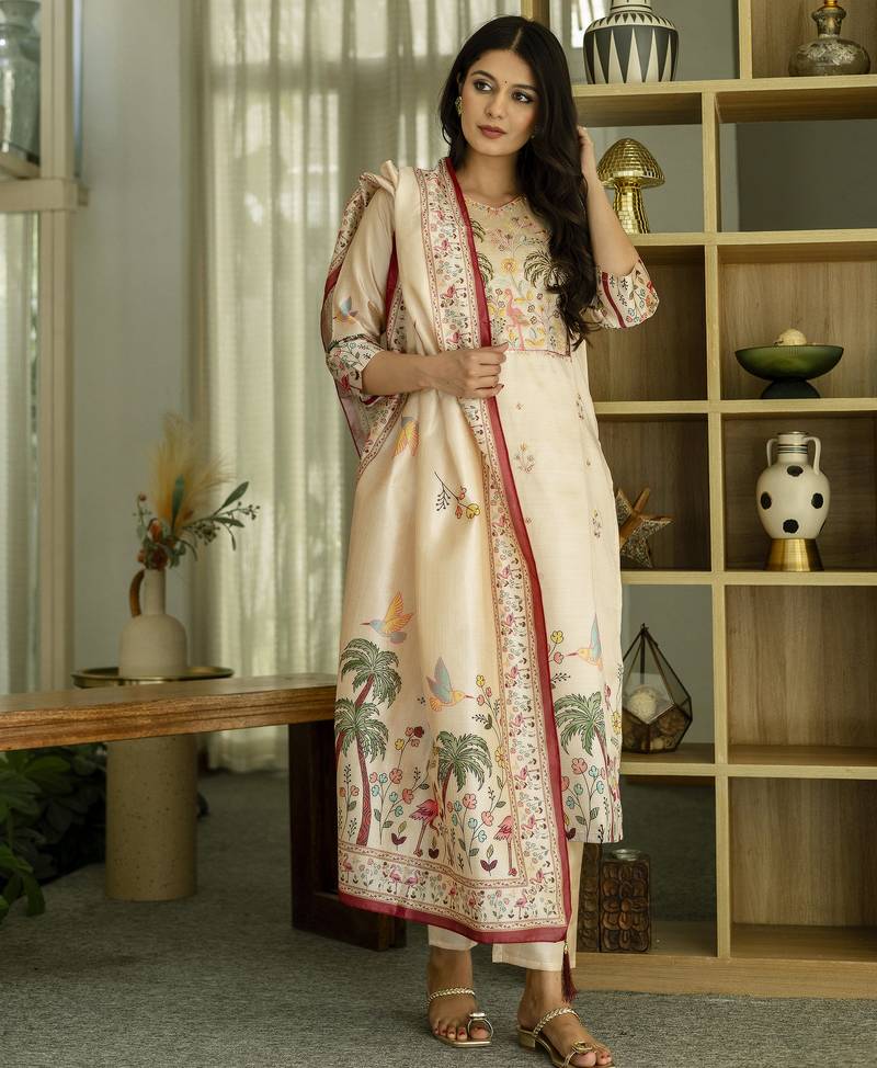 Upgrade your festive and ethnic wardrobe with this elegant Cream kurta pant set for women, crafted in luxurious viscose silk for a soft, flowing drape. The V-neck kurta is adorned with intricate sequin and stone embroidery, adding a sparkling, celebratory charm ideal for weddings, Diwali, Eid, and parties. Paired with tailored pants and a printed silk dupatta, this party wear kurta set for women perfectly blends traditional Pakistani Suit elegance with contemporary style. Lightweight yet opulent, this ensemble offers comfort and style for special occasions, making it a must-have designer kurta set for gifting or personal ethnic styling. Perfect for festive gatherings, cultural events, and formal celebrations, it reflects exquisite craftsmanship and premium quality.